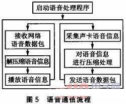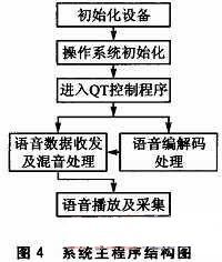 2.3 無線通信模塊與OMAP之間通信 系統的無線通信模塊采用基于RT2571芯片的802.11無線網卡,它工作在2.4 GHz的ISM工作頻段,負責完成各用戶之間語音和數據信息的交換。它與CPU之間通信是通過USB接口實現。 整個系統以超聲波發射和接收電路為核心進行設計,系統采用直接數字頻率合成芯片AD9833產生脈沖串,經過功率放大電路驅動超聲波換能器,超聲波經過懸濁液到達接收換能器,利用92 dB對數放大器AD8307對回波衰減信號進行對數放大,最后由微控制器對數據進行處理得出濃度值。系統還配備了鍵盤、顯示、參數存儲、開關量輸出、繼電器輸出、電流輸出、UART通信等功能。 3 系統軟件設計 本系統軟件可以分為3個功能模塊:語音信息處理模塊、無線通信模塊和QT控制模塊。其中QT控制模塊負責圖形界面顯示和人機接口控制。為了便于實現系統管理,采用基于Linux操作系統的應用程序開發模式,操作系統則選用Linux2.6.29版本。系統主程序結構如圖4所示。