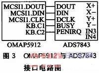 2.2 中央處理器與觸摸屏之間通信 考慮到圖像的直觀性和操控的靈活性,選用三星公司的LTV350QV_FOE觸摸屏,它采用320×240像素液晶輸出方式。對液晶的控制是通過專用芯片ADS7843來完成的。圖3所示是OMAP5912與ADS7843的接口電路圖。OMAP5912通過MCSI接口來實現與ADS7843的命令、數據的串行輸入/輸出,并通過將KB.CX引腳復用成GPIO,然后實現PENIRQ與BUSY信號的中斷觸發。