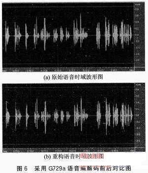 ②無線語音和聲卡數據的收發以及混音處理。它由ARM9內核完成。ARM9內核與DSP內核的通信是通過DSP Gateway雙核通信機制方式實現,由ARM9內核負責控制。對于語音編碼,ARM9負責把AIC23采集的緩存數據寫入到DSP的編碼器中。編碼完的數據放入發送緩存單元,當發送緩沖區放滿之后,ARM端就會將數據通過網口發送出去。然后將編碼后的數據通過無線網卡發送出去。語音解碼與編碼過程相反,首先通過無線網卡接收其他用戶發送過來的比特流,并提取用戶信息,送入DSP端解碼,經過解碼器解碼后,判別當前是否多用戶通信,如果是就啟動混音程序,再輸出至音頻接口,變為模擬語音信號播放。 4 系統測試 測試系統采用3塊OMAP5912開發板和對應的3塊無線網卡。無線網卡選用華碩網卡W167g,采用Ad-Hoc進行組網。針對系統需求,需要測試系統的有效帶寬和語音延遲以及音質。 系統的有效帶寬是保證多用戶語音通話的前提。這里利用Netperf軟件進行分析,測試表明基于UDP的傳輸速度,兩點間的平均速度可達3.4 Mbps。 對于語音通信而言,基于AIC23芯片的語音通信采樣速度是8 kHz,采用16比特單聲道采樣,所需帶寬為128 kbps。而G729a的壓縮率為16:1。故所需帶寬僅為8 kbps。因此,該無線網卡支持多用戶通信。 然后對語音音質進行測試,這里利用由Cooledit2000軟件進行分析,如圖6所示,原始語音和采用G729a語音編解碼處理后的語音波形雖有所損傷,但基本一樣,從音質效果上看,語音清晰,達到MOS=4的語音測試水平。