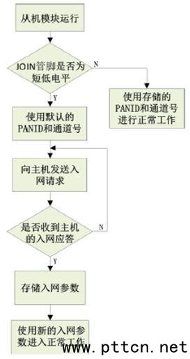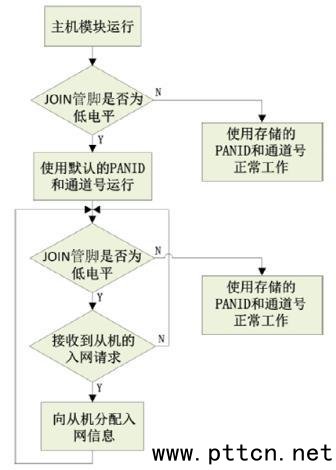 ①當(dāng)JOIN管腳為低電平時(shí),主機(jī)模塊工作在組網(wǎng)模式,此時(shí)主機(jī)模塊允許從機(jī)模塊加入網(wǎng)絡(luò),當(dāng)JOIN管腳變?yōu)楦唠娖綍r(shí),主機(jī)模塊進(jìn)入正常工作流程,此時(shí)從機(jī)模塊不能再加入網(wǎng)絡(luò)。