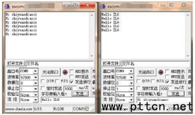 連接PC,分別打開(kāi)兩個(gè)串口調(diào)試助手,進(jìn)行透明數(shù)據(jù)發(fā)送。