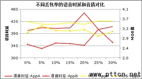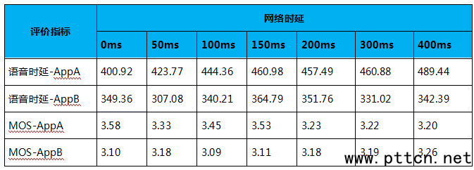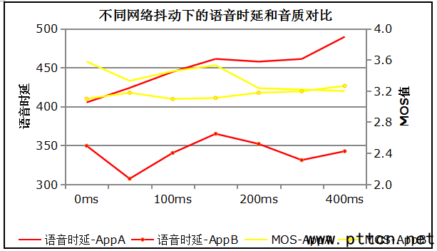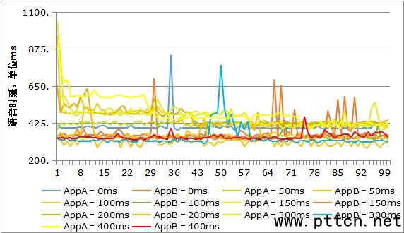 從上圖可以看出,隨著丟包率的遞增,AppA和AppB的MOS分均沒有明顯的變化趨勢,整體的MOS分,AppA高于AppB。隨著丟包率的遞增,AppA和AppB的語音時延均表現(xiàn)出先增加后下降的趨勢(由于測試時網(wǎng)絡(luò)狀態(tài)不同,導(dǎo)致數(shù)據(jù)結(jié)果有一定的差異性),整體的語音時延,AppA的大于AppB。 4.2 抗時延性能 以50ms為步長,從0ms的網(wǎng)絡(luò)時延逐級遞增至400ms,分別評測AppA和AppB在不同網(wǎng)絡(luò)時延條件下的語音時延和MOS分。測試結(jié)果如下: 從上圖可以看出,隨著網(wǎng)絡(luò)時延的增加,AppA的MOS分整體處于輕微的下降趨勢,下降幅度不明顯,AppB整體趨勢較平穩(wěn),MOS分變化不大。在語音時延方面,隨著網(wǎng)絡(luò)時延的增加,AppA的語音時延整體處于增加趨勢,且增加幅度較大,無網(wǎng)絡(luò)時延時的語音時延為400.92ms,當網(wǎng)絡(luò)時延400ms時的語音時延為489.44ms;AppB的語音時延隨著網(wǎng)絡(luò)時延的增加變化不大。整體看,不同網(wǎng)絡(luò)時延下,AppA的語音時延高于AppB。 4.3 通話過程中語音時延的變化情況分析 通過分析不同網(wǎng)絡(luò)時延下的語音時延數(shù)據(jù)流,觀察不同的網(wǎng)絡(luò)時延條件下,從通話開始到通話結(jié)束整個過程中,不同app的語音時延變化情況。