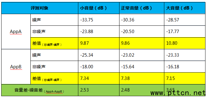 注:上圖中橫坐標軸表示的是通話20分鐘左右的語音時延數(shù)據(jù),每通通話取100組數(shù)據(jù)來分析。粗略估計第10組數(shù)據(jù)大概在通話5-10分鐘左右。 從上圖可以看出,網(wǎng)絡(luò)時延較大的條件下,AppA在通話開始的幾分鐘,語音時延一直處于較高的狀態(tài),大概通話10分鐘左右,語音時延數(shù)據(jù)逐漸趨于平穩(wěn),并可維持平穩(wěn)狀態(tài)一直到通話結(jié)束,因此可以推測,AppA在通話開始時質(zhì)量不是很穩(wěn)定,但是隨著通話時長的增加,會逐步進入一個較好的通話質(zhì)量狀態(tài)。 從AppB的數(shù)據(jù)上來看,無論網(wǎng)絡(luò)時延增加到多少,AppB的語音時延從通話開始就一直處于一個平穩(wěn)狀態(tài),但是在通話過程中,會有偶爾的語音時延波動,可以推測,AppB的整體通話質(zhì)量較平穩(wěn),但中間偶爾會有質(zhì)量不佳的情況。 4.4 噪聲抑制 使用語音音量(圖4-1)和噪聲音量(圖4-2)的Average RMS Power差值進行比對,單位是dB,一般為正數(shù)(語音音量大于噪聲音量),差值越大,NS效果越好。