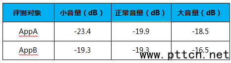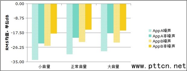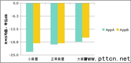 從上表可以看出,無論是小音量、正常音量還是大音量的條件下,AppA的非噪聲減去噪聲的值均大于AppB。音量越大,差值越大。用AppA的音量減去AppB的音量得到音量差,用AppA的噪聲減去AppB的噪聲得到噪音差,最后用音量差-噪音差,得出的值,見上表。在小音量、正常音量和大音量的條件下,所有的差值均大于0,可以認為AppA的噪聲抑制效果較好。 從上圖看出,同一個源聲音文件(噪聲RMS均值為-32.54dB,非噪聲RMS均值為-23.87dB)通過AppA輸出的音頻,小音量時,噪聲能量減少1.21dB,非噪聲基本保持不變,正常音量時,噪聲能量減少2.18 dB,非噪聲減少3.37 dB;大音量時,噪聲減少3.97 dB,非噪聲減少6.1 dB?梢钥闯,對于AppA,播放音量越大,噪聲抑制過程所減弱的音量越多。 通過AppB輸出的音頻,小音量時,噪聲能量減少7.2dB,非噪聲減少5.87 dB,正常音量時,噪聲能量減少9.54 dB,非噪聲減少8.23 dB,大音量時,噪聲能量減少9.21 dB,非噪聲能量減少7.69 dB?梢钥闯,對于AppB,不同音量下輸出的噪聲和非噪聲能量減少相當,無明顯差別。 4.5 音量 注:源聲音文件的Average RMS Power為:-18.69dB。見圖4-3.