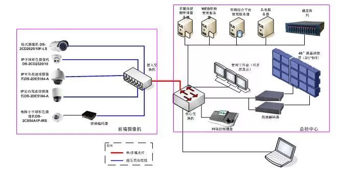 3.2前端設備 攝像部分安裝在監視現場,包括攝像機、鏡頭、防護罩、支架和云臺等。它的作用是對監視區域進行攝像并將其轉換成電信號。 攝像部分是監控系統的前沿,是整個系統的“眼睛”,它把監視的內容變為圖像信號,傳送到控制中心的監視器上,攝像部分的好壞及它產生的圖像信號質量將影響整個系統的質量。 由于本視頻安防監控系統基于IP網絡傳輸,因此除IP攝像機直接接入網絡外,其余所有前端電梯攝像機均接于視頻編碼器,完成監控信號的輸入,把模擬的視頻信號進行數字化和壓縮編碼,形成IP數據包,利用網絡傳送到指定的目的地址。每臺視頻編碼器在網絡上占用1個IP地址,按照就近的原則對前端攝像機進行編碼。 視頻編解碼器支持至少兩種碼流,并且系統采用的視頻流控制技術是可變碼流管理技術,即在設定上限帶寬的情況下可以動態調整任何一路視頻的帶寬。 3.3傳輸部分 從前端設備到視頻編碼器之間的傳輸部分:前端電梯攝像機的視頻信號采用屏蔽視頻電纜,根據攝像機安裝位置采用SYV75-5同軸電纜,以保證監控信息的準確傳輸?刂凭采用RVVP2*1.0屏蔽雙絞電纜。電源線采用RVV2*1.0的電纜。從IP攝像機、視頻編碼器到接入交換機采用六類非屏蔽雙絞線;自接入交換機至監控中心核心交換機采用光纜,從而保證主干的數據帶寬。 3.4控制中心 控制中心是整個系統的“心臟”和“大腦”,是實現整個系統功能的項目。由于整個項目面積較大,還要為二期及后續建筑留有擴展空間,因此要求采用當前主流的數字傳輸解決方案,便于存儲和分控,還可支持網絡遠程查看。 監控中心采用智能安防監控箱作為前端攝像機接入,提供錄像、檢索、系統管理、錄像資料存儲等服務。并實現監控視頻的上墻監看,通過監控客戶端工作站實現系統的管理和實時監控操作?梢詾g覽到所有的前端視頻,可以對所有設備進行操作。 系統配置為: 顯示部分:46"超窄邊液晶拼接單元,3行*5列,亮度450cd/m2,對比度3000:1,拼接縫小于7.3mm,可視角178,響應時間8ms,可提供VGA/RGB/AV/DVI/HDMI接口,含拼接屏配套設備。 報警平面控制示意電子板,包括攝像控制點位(編號)、周界顯示;重點區域報警顯示。 3.5網絡架構設計 由于采用數字監控,此方案設計了監控專網,與工作網絡分開,保證了系統的安全性及可靠性。根據攝像機接入的情況,監控系統的接入交換機采用100M的局域以太網架構,即可滿足視頻監控數據傳輸需求,由于所有數據都要通過中心交換機傳輸所有攝像機的監控、存儲數據以及調用的視頻回放數據,所以建議采用1000M以太網架構,即可滿足監控數據傳輸需求。 3.6存儲系統設計 每個前端存儲總容量(GB)=【視頻碼流大小(Mbps)×60秒×60分×24小時×存儲天數/8】/1024