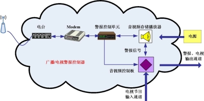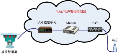 子站由電動(dòng)/電聲警報(bào)控制器及電源等組成。其中電動(dòng)/電聲警報(bào)控制器由無線電臺(tái)、無線Modem、子站控制單元、天/饋線組成。子站控制電動(dòng)、電聲警報(bào)器發(fā)放各種警報(bào)并收集信息回饋中心。子站的組成原理如圖三所示,電動(dòng)/電聲警報(bào)控制器設(shè)備如圖四所示。