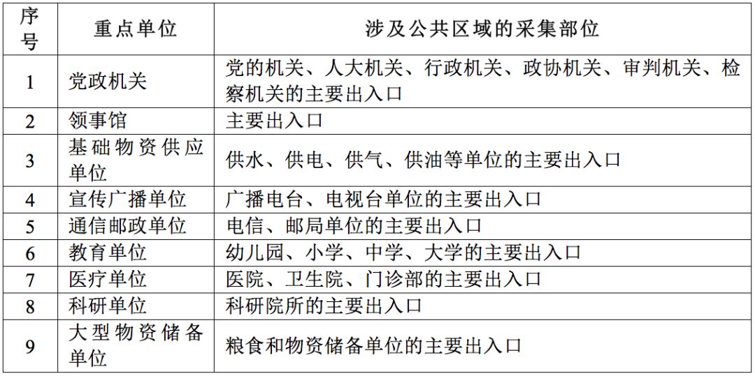 路段場景的特點是:一是車輛行人的行駛方向單一;二是車輛行人的跟隨距離較大。因此在路段上布設(shè)視頻監(jiān)控要求能夠從車輛或行人的正前方采集圖像,以識別車輛行人的局部特征,如車輛的車牌號、車型,行人的面部特征等。 03 重點單位 重點單位是指對維持社會正常運轉(zhuǎn)具有重大作用的單位,如黨政機關(guān)、通信郵政單位、教育單位、醫(yī)療單位等。重點單位涉及公共區(qū)域的采集部位如下表所示。