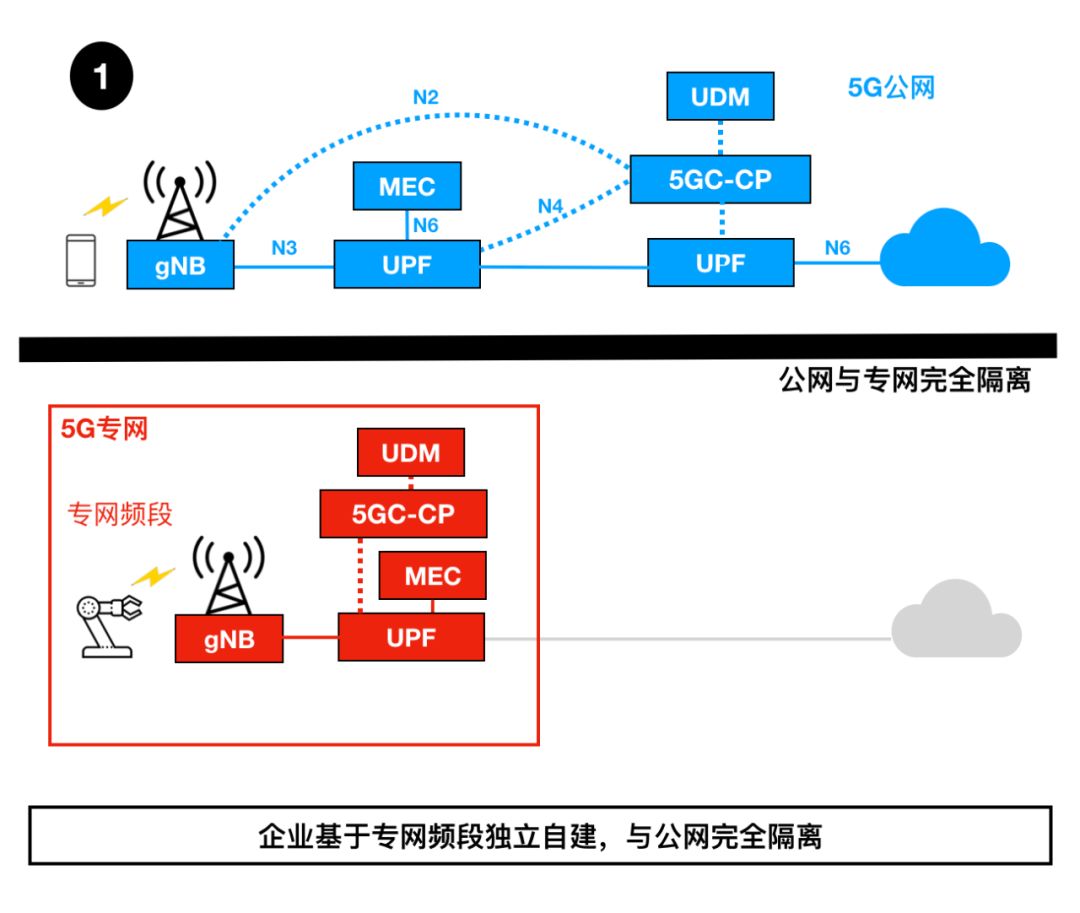 主頁(http://www.130131.com):5G專網(wǎng)7大部署方案 什么是5G專網(wǎng)? 5G專網(wǎng),稱為local 5G network,或者private 5G network,指專用于特定行業(yè)或企業(yè)的移動通信網(wǎng)絡(luò)。 區(qū)別于專網(wǎng),今天我們使用的智能手機(jī)連接的2/3/4/5G移動通信網(wǎng)絡(luò)稱為公網(wǎng)。公網(wǎng)就是一個(gè)“公共場所”,數(shù)以億計(jì)的移動用戶共享同一個(gè)網(wǎng)絡(luò),同樣的頻段資源和網(wǎng)絡(luò)設(shè)備。 專網(wǎng)的概念并不陌生,早在2/3/4G時(shí)代就有了,比如鐵路專網(wǎng)、公共安全專網(wǎng)、軍用專網(wǎng)等。 進(jìn)入5G時(shí)代,專網(wǎng)將會越來越火。 這是因?yàn)?G的最大價(jià)值在于2B垂直行業(yè)市場,在于走進(jìn)各行各業(yè)。未來,工廠、園區(qū)、運(yùn)輸、醫(yī)院、油田、電網(wǎng)、港口等各行各業(yè)都可能擁有5G專網(wǎng),以利用5G大帶寬、低時(shí)延、高可靠、多連接的網(wǎng)絡(luò)能力和邊緣計(jì)算,來實(shí)現(xiàn)數(shù)字化轉(zhuǎn)型,提升生產(chǎn)效率。 既然5G專網(wǎng)這么重要,可怎樣部署呢? 本文來介紹一下5G專網(wǎng)的7大部署方案。 1 企業(yè)基于專網(wǎng)頻段獨(dú)立自建,與公網(wǎng)完全隔離