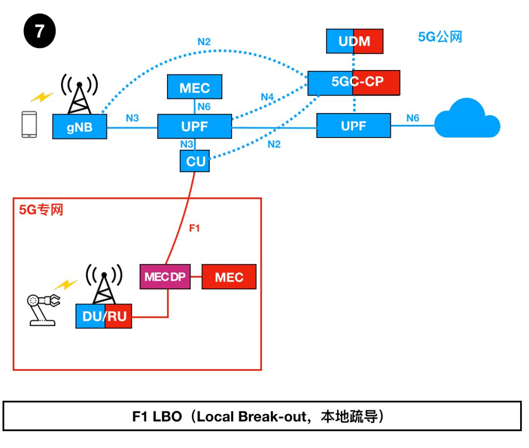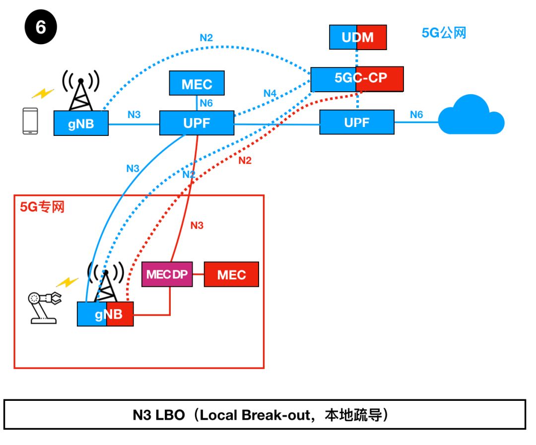 從UDM、5GC CP、UPF、MEC到5G基站,包括控制面和用戶面,5G專網(wǎng)與公網(wǎng)端到端共享。 實(shí)際就是端到端網(wǎng)絡(luò)切片;5G公網(wǎng),為5G專網(wǎng)端到端切出一個(gè)“切片子網(wǎng)絡(luò)”。 在這種部署方式下,用戶信息和數(shù)據(jù)流量的安全性取決于網(wǎng)絡(luò)切片能力。而低時(shí)延保障取決于運(yùn)營商的邊緣云(UPF和MEC)的部署位置。如果運(yùn)營商的邊緣云的位置離企業(yè)很近,那么網(wǎng)絡(luò)時(shí)延也就很低。 6 N3 LBO