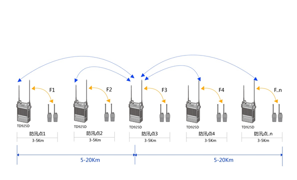 在遇到洪災時,有線通信使用的光纖、無線公網通信所倚靠的電信運營商基站等多被毀或進水便無法保證通話質量,導致人們通常無法使用手機、電腦、固定電話等傳統方式正常通話。通常來說,對講機單機直通的傳輸距離是3-5公里。而從前線水庫堤防現場到后方指揮調度中心之間,通常面臨著距離遠、阻擋物復雜、等眾多干擾因素,通常無法實現有效的關鍵通信。