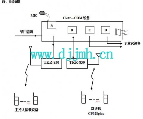 主頁(http://www.130131.com):電視臺轉(zhuǎn)播車無線對講系統(tǒng) 一、概述: 1、 無線通訊系統(tǒng)因具有可移動性,在電視行業(yè)的節(jié)目制作或現(xiàn)場直播工作中,無線通訊系統(tǒng)結(jié)合通話系統(tǒng)會給其帶來靈活機動、事辦功倍的作用。 2、 無線通訊系統(tǒng)與電視行業(yè)中通話系統(tǒng)結(jié)合,稱之為無線導(dǎo)播系統(tǒng),經(jīng)CCTV、天津電視臺、重慶電視臺、廣州電視臺、浙江電視臺、山東電視臺、吉林電視臺、河南電視臺等眾多新聞媒體的廣泛使用,反映良好,不斷地在增容擴展。 3、 無線導(dǎo)播系統(tǒng)與通話系統(tǒng)在通話的功能上是相同的,準(zhǔn)確地說無線導(dǎo)播系統(tǒng)是在通話系統(tǒng)基礎(chǔ)上的無線延伸。 4、 無線導(dǎo)播系統(tǒng)大小規(guī)模,取決于無線通道的路數(shù)以及無線終端的數(shù)量。從電視節(jié)目制作行業(yè)職能分工而言,主要有導(dǎo)演、分導(dǎo)演、主持人、攝像、微波、音響、燈光、劇務(wù)等,但無線導(dǎo)播系統(tǒng)受到占用頻率的限制,以及設(shè)備體積和費用等方面的限制,不可能詳細按上述職能分配相應(yīng)的無線通道。通常將關(guān)鍵的或職能相關(guān)的合用一個無線通道,比如主持人單使用一個通道,攝像、微波等合用一個無線通道,在節(jié)目制作前主持人通道暫劃為劇務(wù)等部門使用,當(dāng)然在節(jié)目制作中若場面不大,所有人員共用一個無線通道也是可行的。 二、 設(shè)備分配: 三、 系統(tǒng)作用