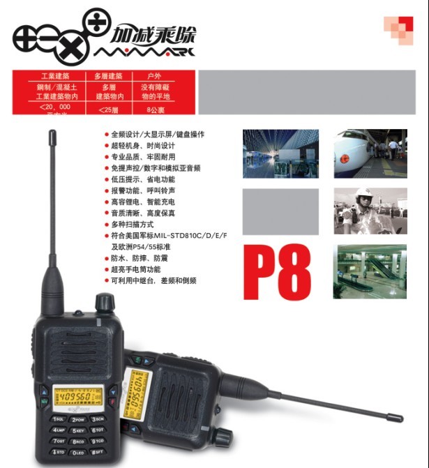 P8對講機(jī)可配備容量高達(dá)1200mAh高級鋰離子電池,即使在5W功率下工作,也可維持14個(gè)小時(shí)以上。