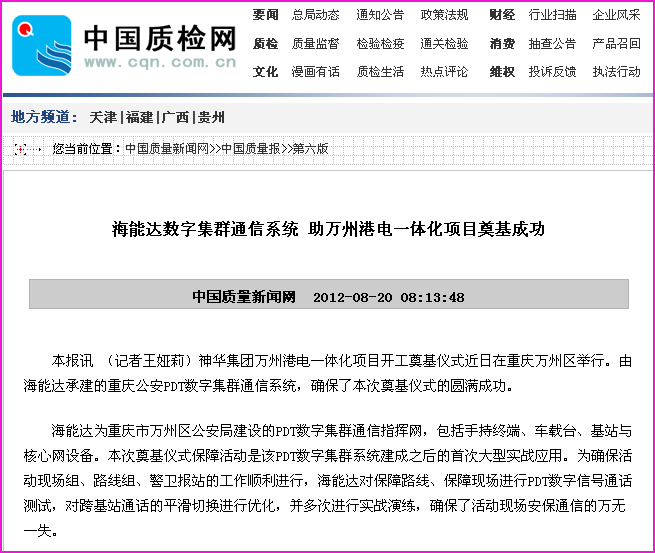 詳情請(qǐng)點(diǎn)擊: 2012年8月20日,中國(guó)質(zhì)量新聞網(wǎng)報(bào)道海能達(dá)數(shù)字集群通信系統(tǒng)助萬(wàn)州港電一體化項(xiàng)目奠基成功。