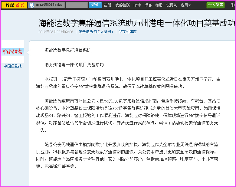 詳情請(qǐng)點(diǎn)擊: 2012年8月20日,搜狐網(wǎng)報(bào)道海能達(dá)數(shù)字集群通信系統(tǒng)助萬(wàn)州港電一體化項(xiàng)目奠基成功。