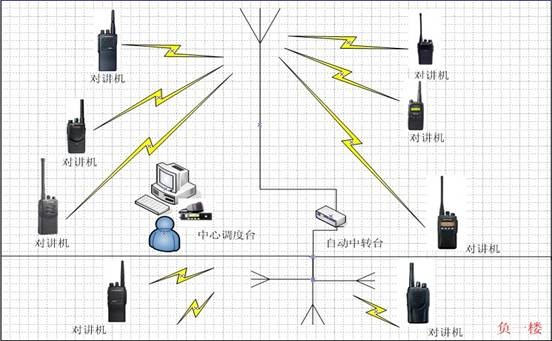 如上圖,手持對講機發(fā)送信息,經(jīng)過中轉(zhuǎn)臺差轉(zhuǎn),就可以把信息傳送到的更遠(yuǎn)距離,使整個系統(tǒng)通訊距離和通訊質(zhì)量大大提高,而且由于是即時通信,可以即時傳遞信息,大大提高貴單位的工作效率和安全性。為覆蓋整個地面和地下信號,使對講機信號得到均勻分布,對天線部分進(jìn)行了網(wǎng)絡(luò)設(shè)計,采用了目前較為先進(jìn)成熟的技術(shù),在地面層、地下層分布天線,這樣, 整個單位范圍內(nèi)的通訊質(zhì)量將大大提高。