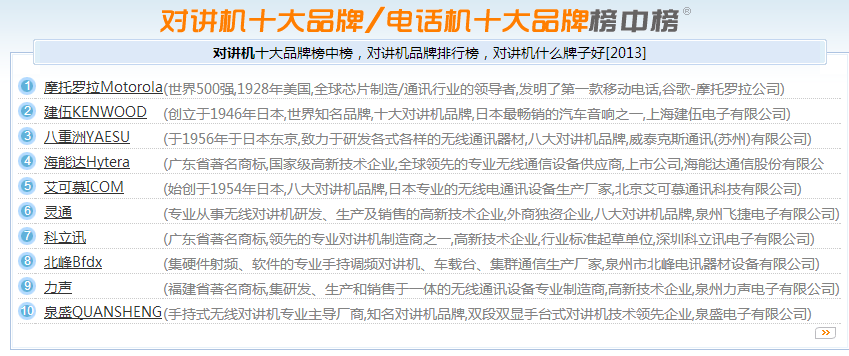 主頁(http://www.130131.com):2013年對講機(jī)十大品牌排行榜