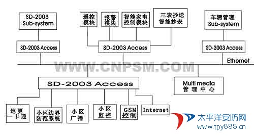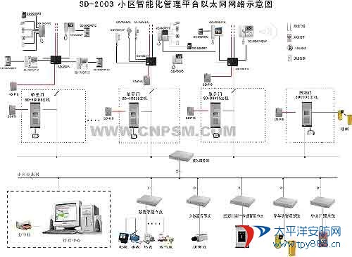 智能小區(qū)應(yīng)用系統(tǒng)示例  SD-2003系統(tǒng)是一個(gè)基于當(dāng)前最前沿的小區(qū)以太網(wǎng)為主干網(wǎng)的智能接入平臺(tái),包括多媒體計(jì)算機(jī)技術(shù)、通信技術(shù)、現(xiàn)場(chǎng)總線技術(shù)、圖像顯示技術(shù)、語音技術(shù)及網(wǎng)絡(luò)遠(yuǎn)程控制等眾多前沿技術(shù)。管理中心電腦與各終端機(jī)采用客戶機(jī)/服務(wù)器模式,主干網(wǎng)采用小區(qū)寬帶網(wǎng)絡(luò),利用國際互聯(lián)網(wǎng)上通用的TCP/IP網(wǎng)絡(luò)傳輸協(xié)議,把音視頻及所有編碼信號(hào)通過智能終端(一臺(tái)裝有智能軟件的接入服務(wù)器)可方便快捷地將樓宇對(duì)講、門禁、物業(yè)信息管理、巡更及周界防范、用戶報(bào)警終端、一卡通、遠(yuǎn)程抄表、智能停車場(chǎng)管理等子功能中的模擬信號(hào)轉(zhuǎn)換成數(shù)字信號(hào)后以終端接入的方式掛接在本系統(tǒng)上。系統(tǒng)本身簡(jiǎn)單到幾乎只需修改計(jì)算機(jī)軟件系統(tǒng)就可實(shí)現(xiàn)整個(gè)系統(tǒng)的擴(kuò)充和升級(jí)。