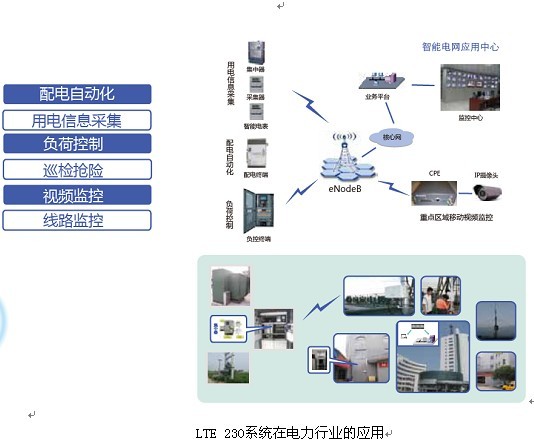其中,LTE 230電力通信專網(wǎng)是中國普天面向配用電側(cè)的用電信息采集、配網(wǎng)自動化與負荷管理、應(yīng)急搶修、檢修、移動應(yīng)急視頻監(jiān)控等業(yè)務(wù)需求,為電力用戶深度定制的大容量、廣覆蓋、高效率、高安全性的無線專網(wǎng)系統(tǒng)。同時,LTE 230系統(tǒng)可直接在230MHz電力專用授權(quán)頻段部署,符合國家對低頻段的技術(shù)升級改造政策。圖5為LTE 230系統(tǒng)在電力行業(yè)的應(yīng)用展示。