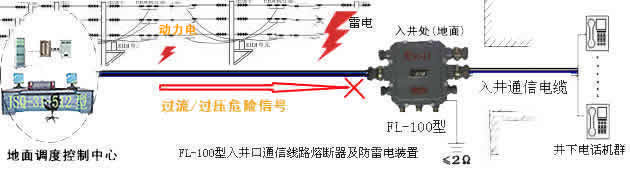 注意事項(xiàng):井下避難硐室(救生艙)內(nèi)的通信線路應(yīng)鋪設(shè)在專用的具有防損毀措施的信號傳輸管線內(nèi).煤礦調(diào)度通信聯(lián)絡(luò)系統(tǒng)配套使用的井下配套部件均應(yīng)采用已獲得國家礦用產(chǎn)品安全標(biāo)志中心頒發(fā)的“安全標(biāo)志準(zhǔn)用證”的產(chǎn)品。 本通信聯(lián)絡(luò)系統(tǒng)拓?fù)鋱D中FL-100型設(shè)備是入井口通信線路熔斷器和防雷電裝置下圖