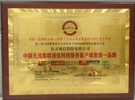 根據(jù)專家、記者、策劃人、公眾及行業(yè)人士的題名,經(jīng)濟網(wǎng)、金牌服務網(wǎng)等多家權威網(wǎng)站對重點題名品牌企業(yè)進行公示,并接受公眾投票。依據(jù)投票反饋數(shù)據(jù),通過對公眾滿意度、服務體系、品牌影響力等指標進行評分,經(jīng)“組委會推薦、公眾投標、評委審核”三方數(shù)據(jù)評分結果,東方通信以大比分超過競爭對手的優(yōu)勢獲得“中國無線集群通信網(wǎng)絡服務客戶滿意第一品牌”。
