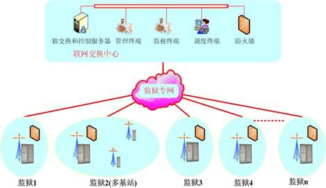 (3)各省可以將已經(jīng)建設(shè)的監(jiān)獄集群系統(tǒng)聯(lián)網(wǎng),實(shí)現(xiàn)各監(jiān)獄的互聯(lián)互通以及對(duì)講機(jī)在所有監(jiān)獄之間的自動(dòng)漫游。聯(lián)網(wǎng)后監(jiān)獄管理局可以任意呼叫和調(diào)度任何一個(gè)監(jiān)獄的對(duì)講機(jī)用戶,達(dá)到應(yīng)急事件的統(tǒng)一指揮調(diào)度和管理。聯(lián)網(wǎng)系統(tǒng)的建設(shè)模式為,在監(jiān)獄管理局建設(shè)系統(tǒng)聯(lián)網(wǎng)中心,配置軟交換服務(wù)器和調(diào)度、管理、監(jiān)視終端。通過(guò)各省的監(jiān)獄專(zhuān)網(wǎng)提供的IP鏈路實(shí)現(xiàn)與各監(jiān)獄集群系統(tǒng)之間的聯(lián)網(wǎng)。