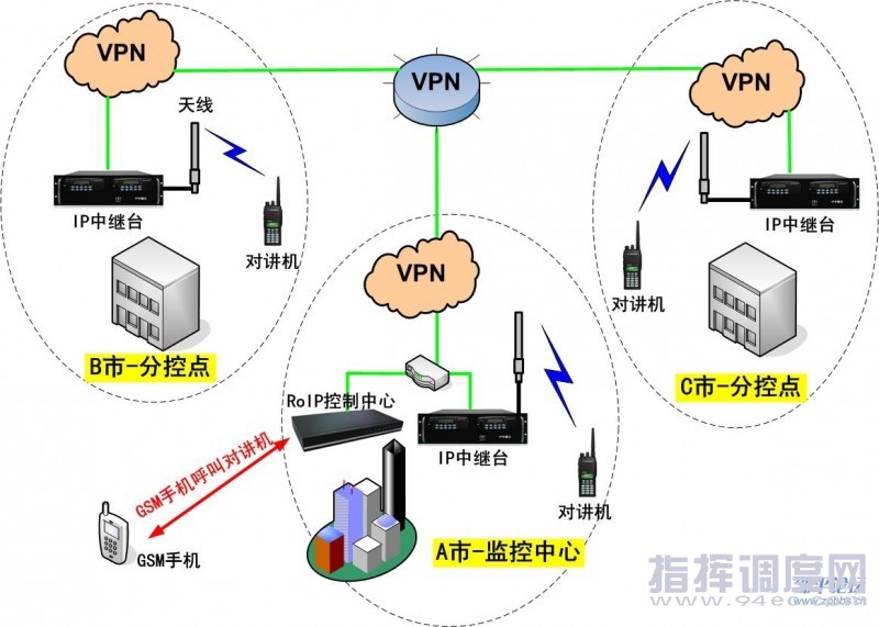 如圖一,在A市監(jiān)控中心和B市、C市分控點各安裝一臺IP中繼臺,可覆蓋該市約10~30公里的區(qū)域,然后通過A市監(jiān)控中心的RoIP控制中心的組網(wǎng)、數(shù)據(jù)交換功能,接入VPN進行聯(lián)網(wǎng),達到對講機跨區(qū)域互聯(lián)互通的目的。 針對領導層用戶,RoIP控制中心提供GSM手機撥打?qū)χv機的功能,達到跨媒體平臺互聯(lián)互通的目的,使領導能及時獲取相關信息。 RoIP對講機應急指示系統(tǒng)部署靈活、擴展方便。當D市的分控點需要并入到系統(tǒng)時,只需要在該分控點增加一臺IP中繼臺然后接入VPN即可。 (中國集群通信網(wǎng) | 責任編輯:陳曉亮) |
