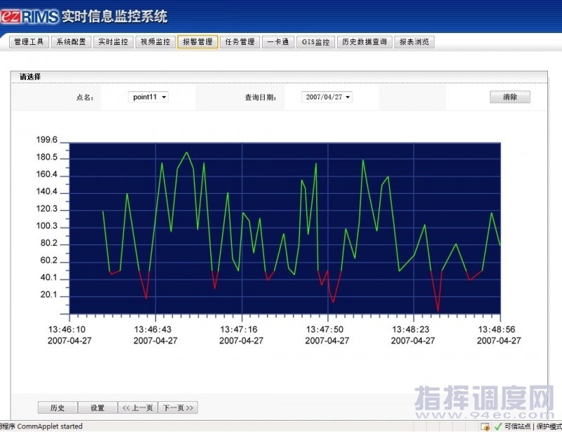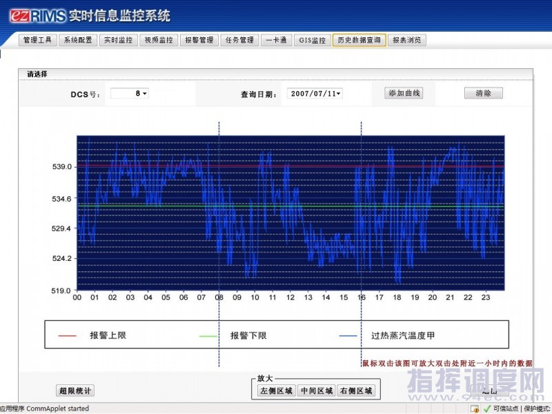 主頁(http://www.130131.com):沈飛生產(chǎn)數(shù)字化綜合視頻指揮調(diào)度系統(tǒng)方案(3) 被指揮調(diào)度者可隨時加入和退出指揮調(diào)度組。 指揮調(diào)度者對多個監(jiān)控前端進行語音廣播。 生產(chǎn)調(diào)度中心的調(diào)度人員在日常生產(chǎn)過程中可以利用視頻指揮調(diào)度功能與各分廠調(diào)度中心的值班人員、各車間現(xiàn)場的工作人員進行業(yè)務(wù)協(xié)調(diào)。 當(dāng)車間現(xiàn)場發(fā)生意外事故或設(shè)備發(fā)生故障,現(xiàn)場人員不能解決,各級領(lǐng)導(dǎo)和相關(guān)專家又不能及時趕到現(xiàn)場,此時可以利用系統(tǒng)的指揮調(diào)度功能召集相關(guān)業(yè)務(wù)主管和專家實時的監(jiān)視現(xiàn)場情況,并與現(xiàn)場人員進行語音實時交流,共同指導(dǎo)現(xiàn)場進行意外事故的處理以及對設(shè)備搶修的技術(shù)指導(dǎo),為現(xiàn)場解決問題提供有力的技術(shù)支持,大大節(jié)省時間,提高工作效率。 4.2模擬圖/流程圖展示 本方案以系統(tǒng)模擬圖的方式允許用戶通過網(wǎng)絡(luò)實時監(jiān)測生產(chǎn)現(xiàn)場系統(tǒng)運行的實際情況,并實時觀測現(xiàn)場的各項指標。 本功能主要完成對控制系統(tǒng)上各個需要監(jiān)控的設(shè)備在系統(tǒng)模擬圖上的顯示形式、顯示位置、相互之間的連接信息等參數(shù)的定義,由此組態(tài)出一幅逼真的生產(chǎn)現(xiàn)場模擬圖,如圖4-1。包括:模擬設(shè)備的實時數(shù)據(jù)顯示、開關(guān)量的實時圖形顯示等;定義各模擬設(shè)備的報警限值以實現(xiàn)故障報警顯示。 ![]() ![]() 4.3報表組態(tài)與展示 系統(tǒng)提供了靈活的報表功能,用戶無需編寫代碼,只需簡單配置即可實現(xiàn)查詢和報表功能,節(jié)省了90%的工作量。系統(tǒng)具有可視化查詢和報表配置界面,可以批量生成文件;針對復(fù)雜的報表,系統(tǒng)提供可引用的報表模板。 這種靈活報表功能可以滿足沈飛的日報表、月報表等的查詢需求,可以快速地收集和顯示所關(guān)心的現(xiàn)場設(shè)備數(shù)據(jù)。由于報表通過對長期的生產(chǎn)過程數(shù)據(jù)進行分析統(tǒng)計,使報表的每列數(shù)據(jù)可以是控制系統(tǒng)的某一項指標,也可以是某幾項指標的運算表達式,并可以在報表內(nèi)進行自動計算、匯總等操作。報表反應(yīng)了現(xiàn)場的實時情況,管理者和系統(tǒng)維護人員能夠?qū)崟r地掌握生產(chǎn)情況并及時地進行分析,從而為沈飛積累了豐富的經(jīng)驗數(shù)據(jù),見圖4-3。 ![]() ![]() 圖4-4多種統(tǒng)計報表圖 通過本系統(tǒng)的實時趨勢曲線,管理者可以查看某一個指定的數(shù)據(jù)庫點或中間點在當(dāng)前時刻下的狀態(tài),同時還可以保存一小段時間的數(shù)據(jù)趨勢,這樣通過系統(tǒng)相關(guān)人員就可以及時了解當(dāng)前生產(chǎn)設(shè)備的運行狀況,便于他們對生產(chǎn)現(xiàn)場進行實時監(jiān)控,見圖4-5。 ![]() 圖4-5 ![]() 圖4-6 在本系統(tǒng)中,用戶可以根據(jù)需要靈活地設(shè)置基于實時數(shù)據(jù)的報警規(guī)則和控制執(zhí)行策略規(guī)則。系統(tǒng)提供GSM/GPRS短信、e-Mail、網(wǎng)頁等多種報警發(fā)送機制,系統(tǒng)管理員和用戶可在系統(tǒng)配置頁面(可遠程)上根據(jù)預(yù)定權(quán)限設(shè)置進行報警事件的記錄、操作、跟蹤。系統(tǒng)還可以根據(jù)聯(lián)動規(guī)則執(zhí)行視頻聯(lián)動,并對報警提供數(shù)字預(yù)案輔助處理功能。 ![]() 圖4-7 4.5視頻會議功能 召開傳統(tǒng)視頻會議,進行雙向音視頻交流互動。主席可以設(shè)定多個例會,每個例會包含相對固定的成員,主席可以方便地組織會議。會議成員可隨時加入和退出會議組。主席可以對各個會場的發(fā)言權(quán)進行控制,并可廣播某一分會場。 總廠管理層,可根據(jù)需要適時召開視頻會議,實現(xiàn)交班會、生產(chǎn)會、總結(jié)會等各種會議,進行多點多方雙向音視頻交流互動。 4.6生產(chǎn)過程視頻監(jiān)控功能 企業(yè)生產(chǎn)調(diào)度中心利用本系統(tǒng)提供的功能,對各分廠調(diào)度、動力熱源及各生產(chǎn)現(xiàn)場等部位進行視頻監(jiān)視。 用戶能靈活切換現(xiàn)場視頻畫面、控制云臺和攝像頭,方便地組合顯示多路視頻畫面顯示。通過網(wǎng)絡(luò),可以實現(xiàn)多種監(jiān)控方式(單攝像頭監(jiān)控、畫中畫監(jiān)控、四畫面監(jiān)控、三九畫面監(jiān)控、十六畫面監(jiān)控等)實時監(jiān)控圖像,見圖4-8。并可以進行云臺控制,如控制攝像頭的左右上下轉(zhuǎn)動以及焦距的拉伸等操作并且具有實時的畫面截取和視頻的錄像、回放功能。 (中國集群通信網(wǎng) | 責(zé)任編輯:陳曉亮) |