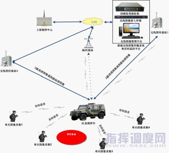 某軍區(qū)無線音視頻傳輸系統(tǒng)由4套標(biāo)清單兵無線音視頻傳輸系統(tǒng)、1套車載式同頻復(fù)用無線音視頻傳輸系統(tǒng)、1套指揮中心同頻復(fù)用接收基站、1套便攜式同頻復(fù)用無線音視頻傳輸系統(tǒng)和其他必要配套設(shè)備組成。組網(wǎng)圖如下所示: 該無線圖像傳輸系統(tǒng)可用于日常巡邏、處置各種突發(fā)時間、進行各型會議保障和用于搶險救災(zāi)等方面。如上圖所示,應(yīng)急指揮車到達事發(fā)地點之后,派出最多四個通信保障人員前往事發(fā)現(xiàn)場周圍進行音視頻信息的采集。通信保證人員攜帶可以雙向語音通信的標(biāo)清單兵式無線圖像傳輸系統(tǒng),可以將現(xiàn)場的信息進行標(biāo)清或高清(720*576清晰度,根據(jù)需要最高可達1920*1080p)的音視頻編碼,加密后通過無線的方式發(fā)射出去,應(yīng)急指揮車上安裝有無線圖像接收機,可以將前端的圖像解密和接收下來。一方面在車上的高清顯示器上顯示出來,供應(yīng)急指揮車上的指揮人員進行觀看,并通過無線語音指揮現(xiàn)場通信保障人員進行下一步動作;另外一方面,通過應(yīng)急指揮車上的車載式同頻復(fù)用無線音視頻傳輸系統(tǒng)將接收到的高清圖像向指揮中心進行傳輸。指揮中心安裝有同頻復(fù)用接收基站,將前端的圖像接收下來,并進入到指揮大屏進行顯示,以供指揮中心的相關(guān)領(lǐng)導(dǎo)進行觀看。此外,指揮中心的圖像還會通過無線圖像接入終端進入到上級無線圖像傳輸系統(tǒng)接入平臺,以便上級領(lǐng)導(dǎo)及時調(diào)看。
