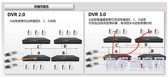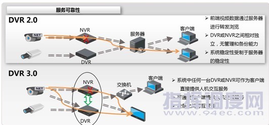 服務(wù)可靠性高 如上圖所示,傳統(tǒng)DVR2.0中一旦某臺NVR設(shè)備故障,即使前端IPC設(shè)備完好,業(yè)務(wù)也無法流轉(zhuǎn)。本方案中的DVR3.0設(shè)備,其中任一某臺NVR設(shè)備的故障,可通過自動搜尋另外一臺完好的DVR設(shè)備,來實現(xiàn)IPC業(yè)務(wù)流的分擔,提高服務(wù)的可靠性。
