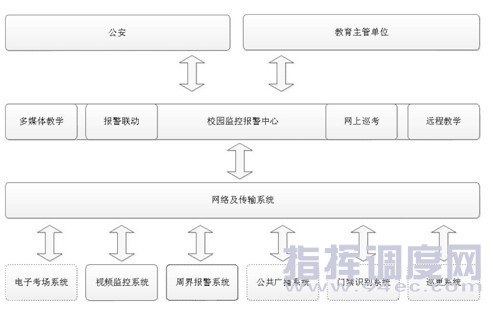 校園安防系統(tǒng)一般由以下子系統(tǒng)組成,根據(jù)教育主管單位的業(yè)務需要和公安部門治安管理的需要將相關圖像信息進行上傳。