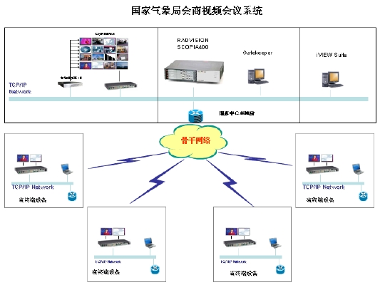 鏡頭切換至國(guó)家氣象局。隨著中國(guó)氣象系統(tǒng)信息化建設(shè)的不斷推進(jìn),視頻會(huì)議系統(tǒng)在氣象部門中的優(yōu)勢(shì)作用也在日益顯現(xiàn)。視頻會(huì)議系統(tǒng)不僅能夠有效的提高工作效率,降低勞動(dòng)成本,還可以非常直觀、有效的實(shí)現(xiàn)會(huì)商,為國(guó)家氣象局打造一個(gè)高效、順暢的溝通平臺(tái)。 國(guó)家氣象局采用 IP 2M 專線網(wǎng)絡(luò),形成專用網(wǎng)絡(luò)環(huán)境,省主會(huì)場(chǎng)網(wǎng)絡(luò)中心以 100M 專線接入運(yùn)營(yíng)商機(jī)房,全網(wǎng)構(gòu)成星型聯(lián)接拓?fù)。?guó)家氣象局領(lǐng)導(dǎo)希望利用RADVISION的多媒體統(tǒng)一通信技術(shù),突出信息化優(yōu)勢(shì),有效提高指揮決策的效率,并在遇到突發(fā)事件和緊急情況下,能夠及時(shí)做出應(yīng)答。如市政府應(yīng)急指揮、交通、防汛等各種應(yīng)急預(yù)案,均可利用視頻服務(wù)系統(tǒng)及時(shí)了解情況、發(fā)布決策并協(xié)調(diào)相關(guān)工作。 針對(duì)國(guó)家氣象局的上述要求,結(jié)合國(guó)家氣象局的網(wǎng)絡(luò)產(chǎn)品,RADVISION基于國(guó)際流行的ITU H.323 通信標(biāo)準(zhǔn),以 MCU為中心輻射各個(gè)會(huì)場(chǎng)電視會(huì)議終端的星型網(wǎng)絡(luò)結(jié)構(gòu)。整套系統(tǒng)由38 個(gè)會(huì)場(chǎng)組成,網(wǎng)管中心放置一臺(tái)RADVISION SCOPIA 400多點(diǎn)會(huì)議控制單元,以便對(duì)全網(wǎng)終端控制,實(shí)現(xiàn)多點(diǎn)間和點(diǎn)對(duì)點(diǎn)的視頻溝通。