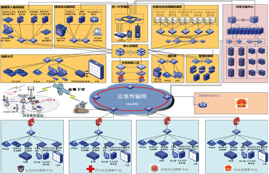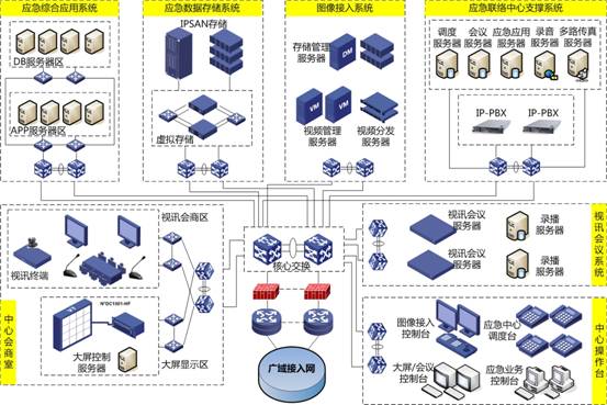 主頁(yè)(http://www.130131.com):應(yīng)急指揮中的網(wǎng)絡(luò)支撐 應(yīng)急指揮系統(tǒng)的建設(shè)對(duì)自然災(zāi)害、事故災(zāi)難、公共衛(wèi)生和社會(huì)安全等重大事件具有重要意義。目前由于無(wú)法滿(mǎn)足應(yīng)急語(yǔ)音通訊、圖像接入、視訊會(huì)商、信息共享與交互等新型應(yīng)急業(yè)務(wù)需求,多數(shù)已建的政府和各專(zhuān)項(xiàng)應(yīng)急指揮中心面臨改建、擴(kuò)建或新建;同時(shí)由于應(yīng)急指揮涉及政府多個(gè)部門(mén)協(xié)同作戰(zhàn),需要大量的廣域數(shù)據(jù)交互和共享。通常應(yīng)急指揮系統(tǒng)包含應(yīng)急指揮中心即大腦,多個(gè)部門(mén)間、中心與現(xiàn)場(chǎng)間的有效溝通和信息共享即神經(jīng)末梢和四肢,以及傳遞這些信息的支撐網(wǎng)絡(luò)即神經(jīng)網(wǎng)絡(luò)。因此在應(yīng)急指揮系統(tǒng)中傳遞可靠信息的支撐網(wǎng)絡(luò)至關(guān)重要。根據(jù)應(yīng)急信息傳輸業(yè)務(wù)的場(chǎng)景來(lái)看應(yīng)急支撐網(wǎng)絡(luò)可以分為: 1、 中心局域網(wǎng):支撐應(yīng)急指揮中心內(nèi)部各業(yè)務(wù)系統(tǒng)之間信息交互; 2、 橫向廣域接入網(wǎng):支撐應(yīng)急指揮中心與各個(gè)專(zhuān)項(xiàng)應(yīng)急指揮中心間信息交互; 3、 縱向廣域接入網(wǎng):支撐應(yīng)急指揮中心縱向與上下級(jí)應(yīng)急指揮中心間信息交互; 4、 衛(wèi)星接入網(wǎng)絡(luò):支撐應(yīng)急指揮中心到現(xiàn)場(chǎng)救援指揮中心間信息交互; 5、 現(xiàn)場(chǎng)無(wú)線(xiàn)接入網(wǎng)絡(luò):支撐現(xiàn)場(chǎng)指揮中心與現(xiàn)場(chǎng)單兵系統(tǒng)間信息交互; 業(yè)務(wù)信息交互主要包括語(yǔ)音通訊、圖像接入、視訊會(huì)議和其他應(yīng)急相關(guān)業(yè)務(wù)信息交互等。 針對(duì)以上業(yè)務(wù)交互需求,應(yīng)急指揮支撐網(wǎng)絡(luò)可分為中心局域網(wǎng)、廣域接入網(wǎng)和應(yīng)急移動(dòng)平臺(tái),應(yīng)急指揮支撐網(wǎng)絡(luò)整體設(shè)計(jì)如圖1所示。 ![]() 圖1 應(yīng)急指揮支撐網(wǎng)絡(luò)整體設(shè)計(jì) 可以看出中心局域網(wǎng)主要實(shí)現(xiàn)應(yīng)急指揮中心各個(gè)子系統(tǒng)間的互連,包括:應(yīng)急綜合應(yīng)用系統(tǒng)、語(yǔ)音調(diào)度指揮系統(tǒng)、圖像接入系統(tǒng)、視訊會(huì)商系統(tǒng)、數(shù)據(jù)中心和存儲(chǔ)以及中心控制區(qū)等子系統(tǒng)。廣域接入網(wǎng)主要實(shí)現(xiàn)橫向政府與各個(gè)專(zhuān)項(xiàng)部門(mén)間和縱向各級(jí)政府間的互連,傳輸語(yǔ)音調(diào)度、應(yīng)急信息、圖像接入、視訊會(huì)商等業(yè)務(wù)。應(yīng)急移動(dòng)平臺(tái)包括了移動(dòng)指揮中心和單兵單元,相應(yīng)的承載網(wǎng)絡(luò)由上行接入網(wǎng)、核心交換網(wǎng)和現(xiàn)場(chǎng)無(wú)線(xiàn)接入網(wǎng)組成。 1.1 中心局域網(wǎng)建設(shè) 通常應(yīng)急指揮系統(tǒng)包含多個(gè)子系統(tǒng),各個(gè)子系統(tǒng)間的融合協(xié)作實(shí)現(xiàn)輔助應(yīng)急指揮功能,其中需要大量的多媒體數(shù)據(jù)和應(yīng)急數(shù)據(jù)的交互和計(jì)算,高可靠和高交換性能的中心局域網(wǎng)是非常必要的;同時(shí)由于各個(gè)子系統(tǒng)建設(shè)和開(kāi)發(fā)周期不同,中心局域網(wǎng)需要可擴(kuò)展性設(shè)計(jì)便于各個(gè)子系統(tǒng)分步驟分階段建設(shè)。因此基于可擴(kuò)展性、可靠性、高交換性能的設(shè)計(jì)原則,同時(shí)遵循可擴(kuò)展的分區(qū)設(shè)計(jì)方法,中心局域網(wǎng)整體設(shè)計(jì)如圖2所示。 ![]() 圖2 中心局域網(wǎng)設(shè)計(jì) 根據(jù)各個(gè)子系統(tǒng)劃分不同網(wǎng)絡(luò)區(qū)域,每個(gè)區(qū)域?yàn)橐粋(gè)網(wǎng)絡(luò)模型,各子系統(tǒng)對(duì)應(yīng)不同的網(wǎng)絡(luò)模塊,分為:核心交換區(qū)、應(yīng)急數(shù)據(jù)存儲(chǔ)區(qū)、應(yīng)急應(yīng)用系統(tǒng)支撐區(qū)、應(yīng)急聯(lián)絡(luò)中心支撐區(qū)、圖像接入支撐區(qū)、視訊會(huì)商支撐區(qū)、中心會(huì)商室和中心操作臺(tái)等。 首先部署核心交換區(qū),由高交換性能的高端多業(yè)務(wù)交換機(jī)組建,保證應(yīng)急指揮中心內(nèi)部的各個(gè)子系統(tǒng)間的快速高效信息交互;同時(shí)可內(nèi)置或外置安全板卡接入廣域網(wǎng),實(shí)現(xiàn)系統(tǒng)間信息安全、可靠的傳遞。 應(yīng)急綜合應(yīng)用系統(tǒng)根據(jù)應(yīng)急大容量信息交換和業(yè)務(wù)突發(fā)性質(zhì)的需求,統(tǒng)一部署高性能的數(shù)據(jù)中心交換機(jī)。本區(qū)域核心部署兩臺(tái)高性能高端數(shù)據(jù)中心交換機(jī),連接應(yīng)用服務(wù)區(qū)和數(shù)據(jù)庫(kù)服務(wù)區(qū),同時(shí)雙歸屬接入到中心局域網(wǎng)的核心交換區(qū),保證與其他子系統(tǒng)和外部系統(tǒng)間的可靠信息快速交互;應(yīng)用服務(wù)區(qū)和數(shù)據(jù)庫(kù)服務(wù)區(qū)分別采用高性能匯聚型數(shù)據(jù)中心交換機(jī),滿(mǎn)足內(nèi)部大容量運(yùn)算信息交互需求。 應(yīng)急數(shù)據(jù)存儲(chǔ)系統(tǒng)、圖像接入系統(tǒng)、應(yīng)急聯(lián)絡(luò)中心支撐系統(tǒng)、視訊會
