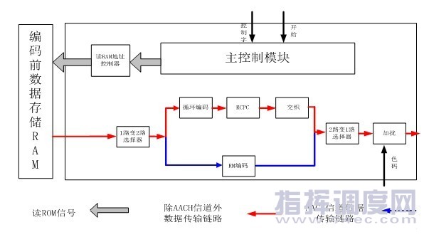 圖2 TETRA系統(tǒng)信道編碼器的結(jié)構(gòu) TETRA數(shù)字集群系統(tǒng)信道編碼器主要由兩大類模塊構(gòu)成:控制模塊和編碼模塊。 (1)控制模塊 控制模塊主要由主控制模塊、讀RAM地址控制器、1路變2路選擇器以及2路變1路選擇器。根據(jù)TETRA數(shù)字集群協(xié)議棧所要求編碼的邏輯信道類型,主控制模塊控制整個編碼模塊的工作。讀RAM地址控制器通過對讀地址的控制,實(shí)現(xiàn)了不同等級的分類。1路變2路選擇器將AACH的編碼數(shù)據(jù)和其他邏輯信道的編碼數(shù)據(jù)分離。2路變1路選擇器將兩路編碼數(shù)據(jù)合并成一路數(shù)據(jù),然后進(jìn)入擾碼模塊。 (2)編碼模塊 編碼模塊主要由循環(huán)編碼模塊、RM(Reed-Muller)編碼模塊、卷積編碼模塊、交織模塊以及加擾模塊組成。循環(huán)編碼模塊是由移位寄存器實(shí)現(xiàn)的,在加入CRC校驗(yàn)碼之后,還加入了4個比特的尾碼。RM(Reed-Muller)編碼模塊只應(yīng)用于AACH邏輯信道。卷積編碼模塊支持TETRA協(xié)議中規(guī)定的各種碼率。交織模塊由塊內(nèi)交織和塊間交織兩個子模塊組成。在編碼之前,加擾模塊需要協(xié)議棧提供色碼參數(shù),才能正確輸出編碼結(jié)果。 在獲知協(xié)議棧所要求編碼的邏輯信道類型之后,主控制模塊開始從存儲數(shù)據(jù)的RAM中讀取待編碼數(shù)據(jù),讀取的個數(shù)隨著邏輯信道類型的不同而不同。因?yàn)榇幋a數(shù)據(jù)是按順序存入RAM中,而TETRA數(shù)字集群系統(tǒng)中語音信道的編碼方案采用了非均等保護(hù),要求輸入編碼器的碼元順序按等級分類,所以在對語音數(shù)據(jù)進(jìn)行編碼之前,主控制模塊通過讀RAM地址控制器模塊來控制讀RAM的地址順序,從而完成等級分類。