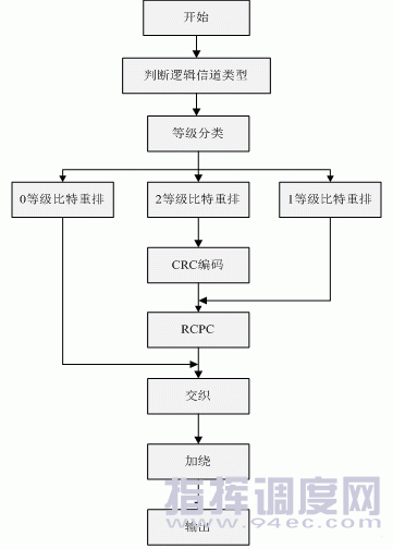 圖3 TETRA語音業(yè)務(wù)信道編碼流程 在接收到編碼指令之后,信道編碼器首先判斷協(xié)議棧要求編碼的邏輯信道類型,并根據(jù)邏輯信道類型從語音緩存區(qū)里讀取數(shù)據(jù):全時隙業(yè)務(wù)信道(TCH/F)讀取274比特的數(shù)據(jù);半時隙業(yè)務(wù)信道(TCH/H)讀取137比特的數(shù)據(jù)。由于語音緩存區(qū)里的比特流級別順序是混亂的,所以必須對比特進(jìn)行重排,將各級別數(shù)據(jù)分類,并按順序排放。只對第二等級的比特進(jìn)行CRC編碼,在第二等級比特流末端加入CRC校驗(yàn)值之后,還要再加入4比特尾碼。根據(jù)395-2協(xié)議,業(yè)務(wù)信道編碼前的碼元是逆序進(jìn)入移位寄存器的,即最先進(jìn)入編碼模塊,最后進(jìn)入移位寄存器;最后進(jìn)入編碼模塊,最先進(jìn)入移位寄存器。當(dāng)進(jìn)行RCPC編碼時,首先對第1等級比特進(jìn)行卷積,然后對第2等級比特(包括CRC校驗(yàn)碼和尾碼)進(jìn)行運(yùn)算。第1等級和第2等級的比特所進(jìn)行刪余的碼率是不同的,但處理是連續(xù)進(jìn)行的,在碼率轉(zhuǎn)換的時刻,寄存器不要清空。對所有比特進(jìn)行交織和加擾。 5 結(jié)束語 本文對TETRA數(shù)字集群系統(tǒng)語音業(yè)務(wù)信道所采用的糾錯編碼技術(shù)進(jìn)行了分析,闡述了語音業(yè)務(wù)信道的編碼流程,并給出了用FPGA實(shí)現(xiàn)編碼器的方案,為進(jìn)一步的研究與開發(fā)提供參考。