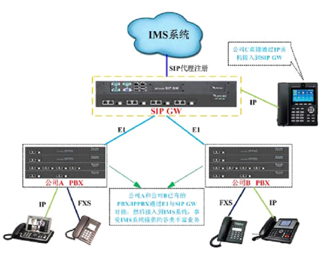 企業(yè)單位已有的PBX/IPPBX通過E1與SIP GW對(duì)接,SIP GW通過SIP代理注冊(cè)到IMS系統(tǒng),從而實(shí)現(xiàn)企業(yè)用戶享受IMS提供的各類豐富業(yè)務(wù),如多媒體會(huì)議,手機(jī)和分機(jī)虛擬網(wǎng),視頻電話等;此外,還可利用SIP GW可直帶IP用戶的功能,來為用戶擴(kuò)容,提供遠(yuǎn)程接入等。SIP GW的接入方式提供統(tǒng)一管理,維護(hù),計(jì)費(fèi),利于企事業(yè)單位的高效通信運(yùn)行需求。