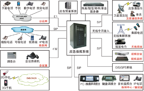 應急指揮系統(tǒng)充分利用已建的公眾與專用通信網(wǎng)絡,整合有線與無線通信資源,實現(xiàn)與上下各級應急信息系統(tǒng)與突發(fā)公共事件現(xiàn)場間的信息傳送,實現(xiàn)應急指揮中心與公安、消防、三防、衛(wèi)生等指揮中心之間、與各地市應急聯(lián)動指揮系統(tǒng)之間的語音通信和調(diào)度,確保應急處置時聯(lián)絡的安全、可靠、通暢,保障在緊急情況下能夠順利開展應急指揮工作。