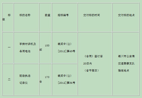 主頁(http://www.130131.com):銀川市政府采購中心采購銀川市公安局交通警察支隊手持對講機(jī)、現(xiàn) 根據(jù)《中華人民共和國政府采購法》、《中華人民共和國招標(biāo)投標(biāo)法》的有關(guān)規(guī)定,銀川市政府采購中心按照銀川市政府采購辦公室下達(dá)的集中采購計劃,由采購人委托具體組織實施對銀川市公安局交通警察支隊手持對講機(jī)、現(xiàn)場執(zhí)法記錄儀項目的采購事宜。為了保證所需標(biāo)的達(dá)到質(zhì)量可靠、價格合理、交貨及時和服務(wù)周到,決定對本項目采用公開招標(biāo)的方式進(jìn)行采購,具體采購事宜如下: 一、采購內(nèi)容及交付時間、地點: