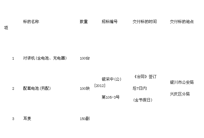 主頁(http://www.130131.com):銀川市公安局興慶區(qū)分局對講機(jī)及配套電池、耳麥公開招標(biāo)招標(biāo)公告 根據(jù)《中華人民共和國政府采購法》、《中華人民共和國招標(biāo)投標(biāo)法》的有關(guān)規(guī)定,銀川市政府采購中心按照銀川市政府采購辦公室下達(dá)的集中采購計劃,由采購人委托具體組織實施對銀川市公安局興慶區(qū)分局對講機(jī)及配套電池、耳麥的采購事宜。為了保證所需標(biāo)的達(dá)到質(zhì)量可靠、價格合理、交貨及時和服務(wù)周到,決定對本項目采用公開招標(biāo)的方式進(jìn)行采購,具體采購事宜如下: 一、采購內(nèi)容及交付時間、地點: